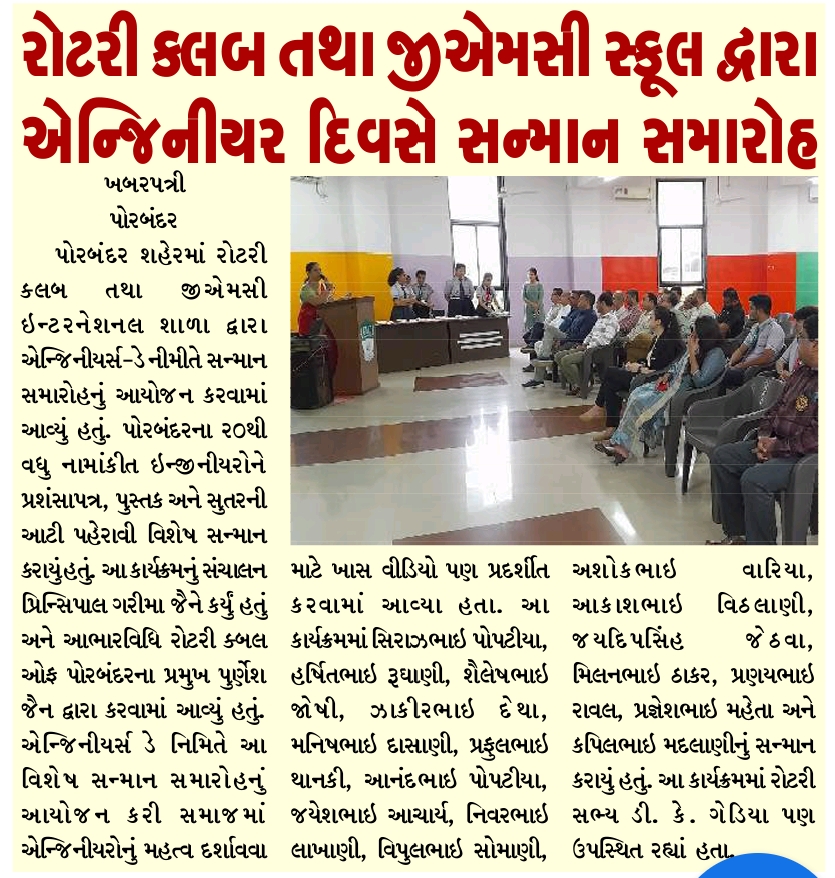 Rotary Club of Porbandar and GMC International School was pleased to organize Engineers Day today . 20+ Prominent Engineers of Porbandar were felicitated by RC Porbandar with a Certificate of appreciation , a book and Sutar Ki Dori. A Honorary breakfast was also organised as a fellowship gesture. Special videos were played to showcase the importance of Engineers in the society. On the occasion Senior Engineers like Sirazbhai Popatia, Harshit Bhai Rughani, Shaileshbhai Joshi, Zakirbhai Detha, Manishbhai Dasani, Prafful Bhai Thanki, Anandbhai Popatia, Jayeshbhai Acharya, Anilbhai Motivaras, Nirmeshbhai Mehta, Niravbhai Lakhani, Vipulbhai Somani, Manishbhai Nandha, Akashbhai Vithlani, Rushabhbhai Varia, Milanbhai Thakrar, Jaydeepsinh Jethwa, Pranaybhai Raval, Pragneshbhai Mehta and Kapilbhai Madlani were felicitated on the day. Program was anchored by Principal Garima Jain and vote of thanks was given by Rotary President Rtn. Purnesh Jain. President of Engineers Association Rt
