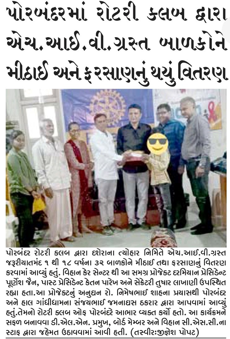 Rotary Club of Porbandar Distributed Sweets and Snacks on the occasion of Dusshera festival to the HIV positive Kids. This distribution was coordinated in cooperation by Vihan Care center. The distribution was done on 4th October under the presence of President Purnesh Jain , Past President Ketan Parikh, Secretary Tushar Lakhani. The donation for the sweets were contributed by Sanjabhai Jamnadas Thakrar through Rtn. Nimeshbhai Shah.
